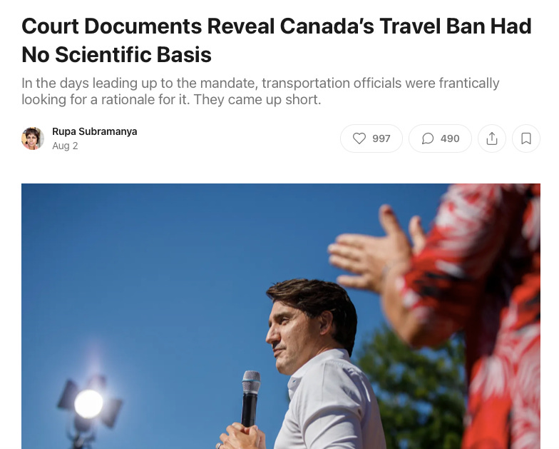 My guest on today’s podcast published new reporting at Bari Weiss’s Substack, Common Sense, in a piece titled “Court Documents Reveal Canada’s Travel Ban Had No Scientific Basis.”