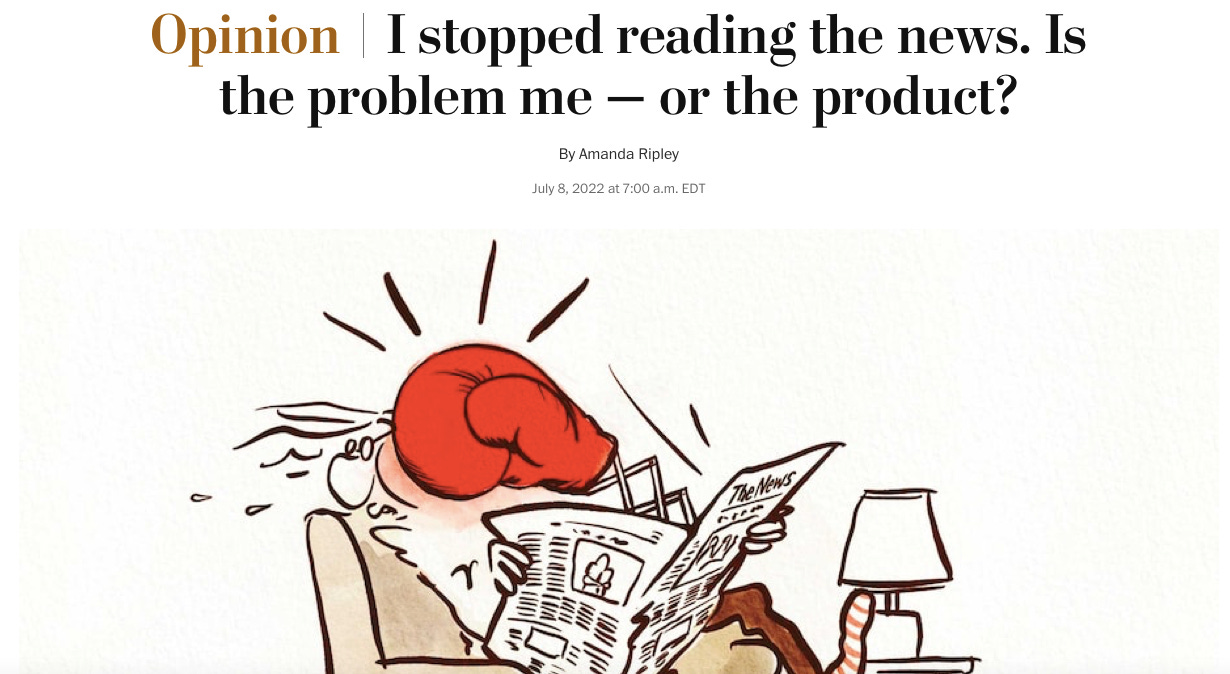 Amanda Ripley’s piece is titled, “I stopped reading the news — is the problem me, or the product?” In it, she poses a question that few have been willing to ask. And that is: “If so many of us feel poisoned by our products, might there be something wrong with them?”