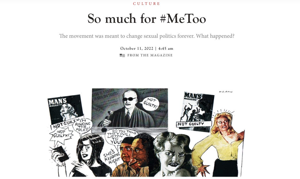 My guest on the podcast today does just this in a new piece for The Spectator, “So much for #MeToo.”